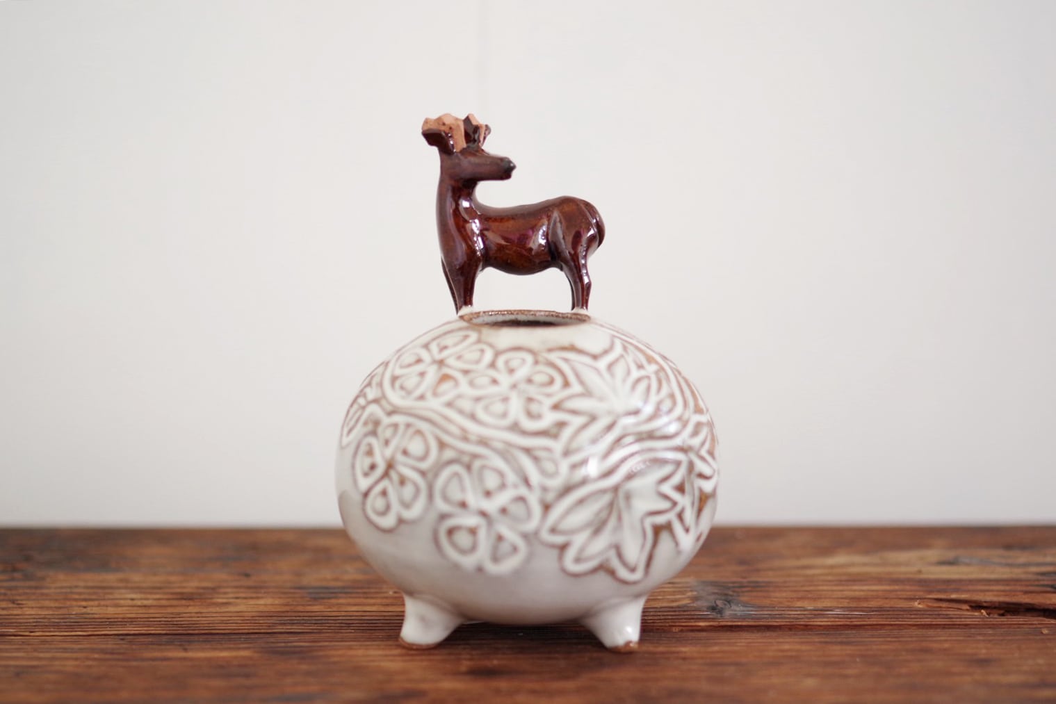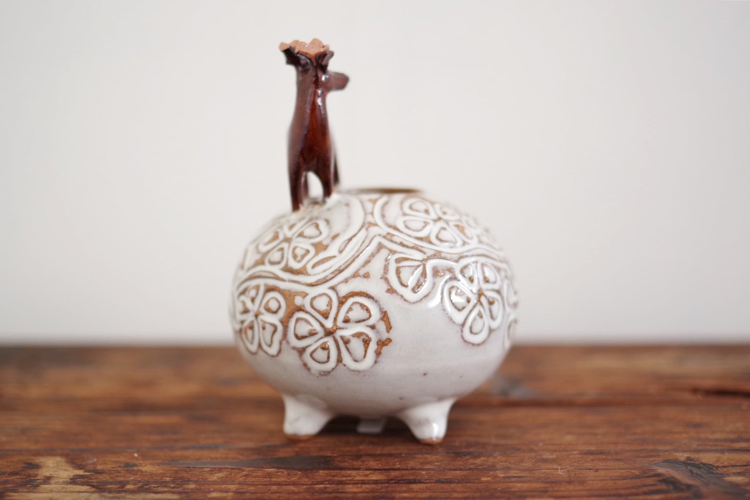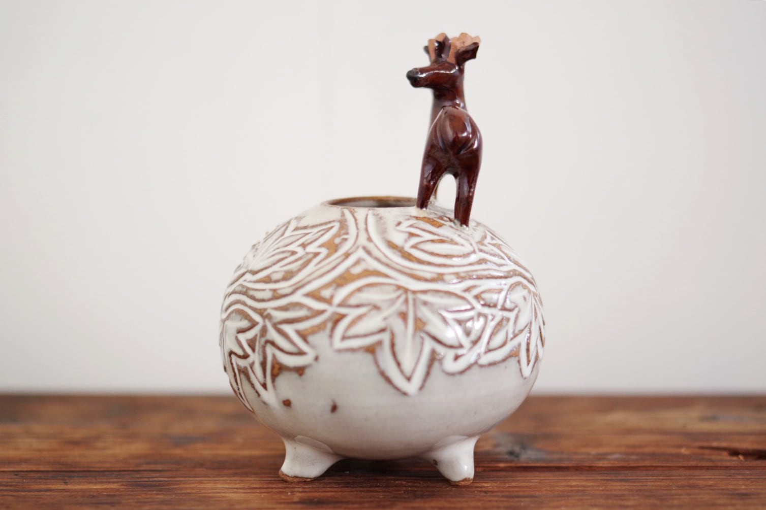 赤膚焼 雲錦彫鹿付き丸壺