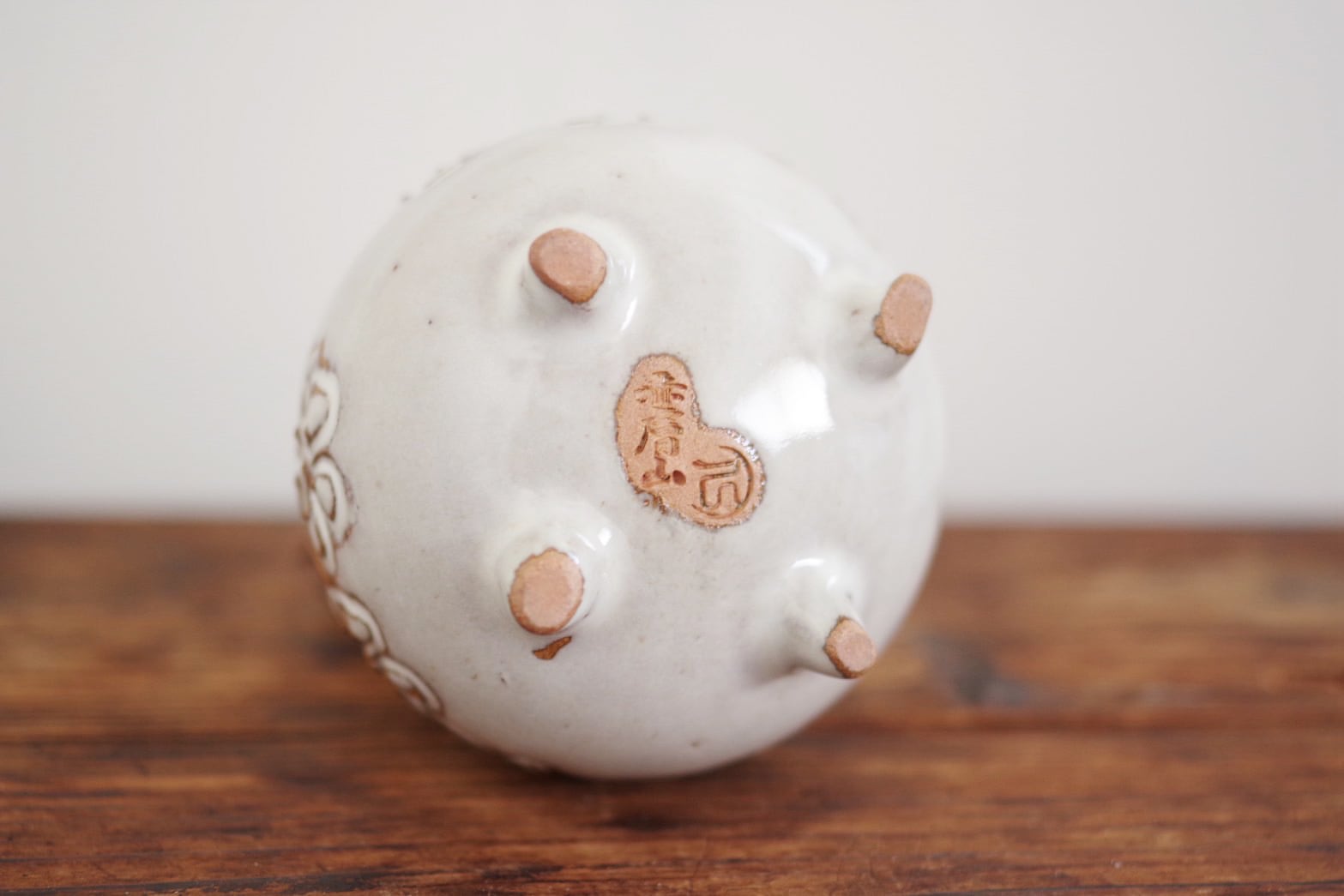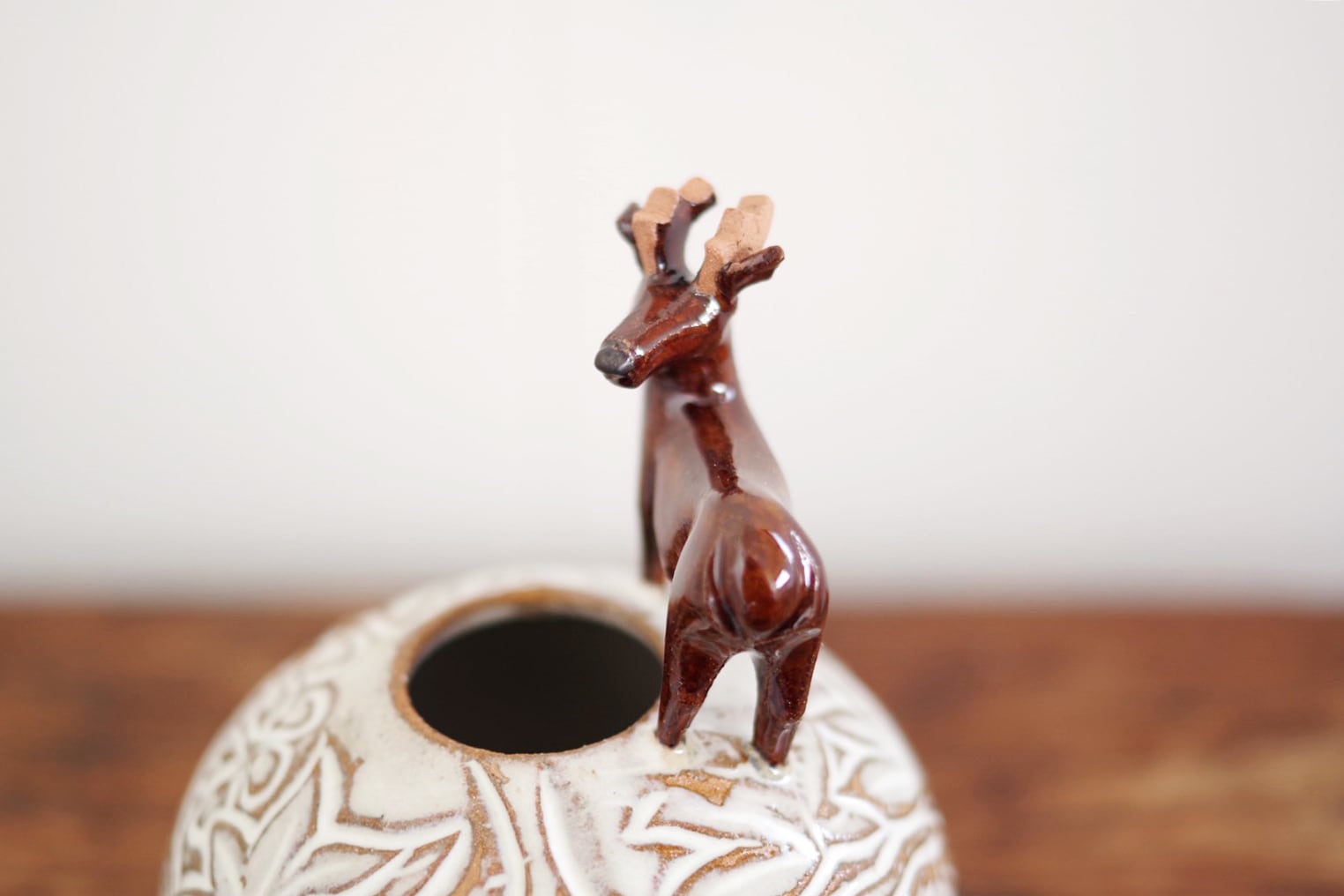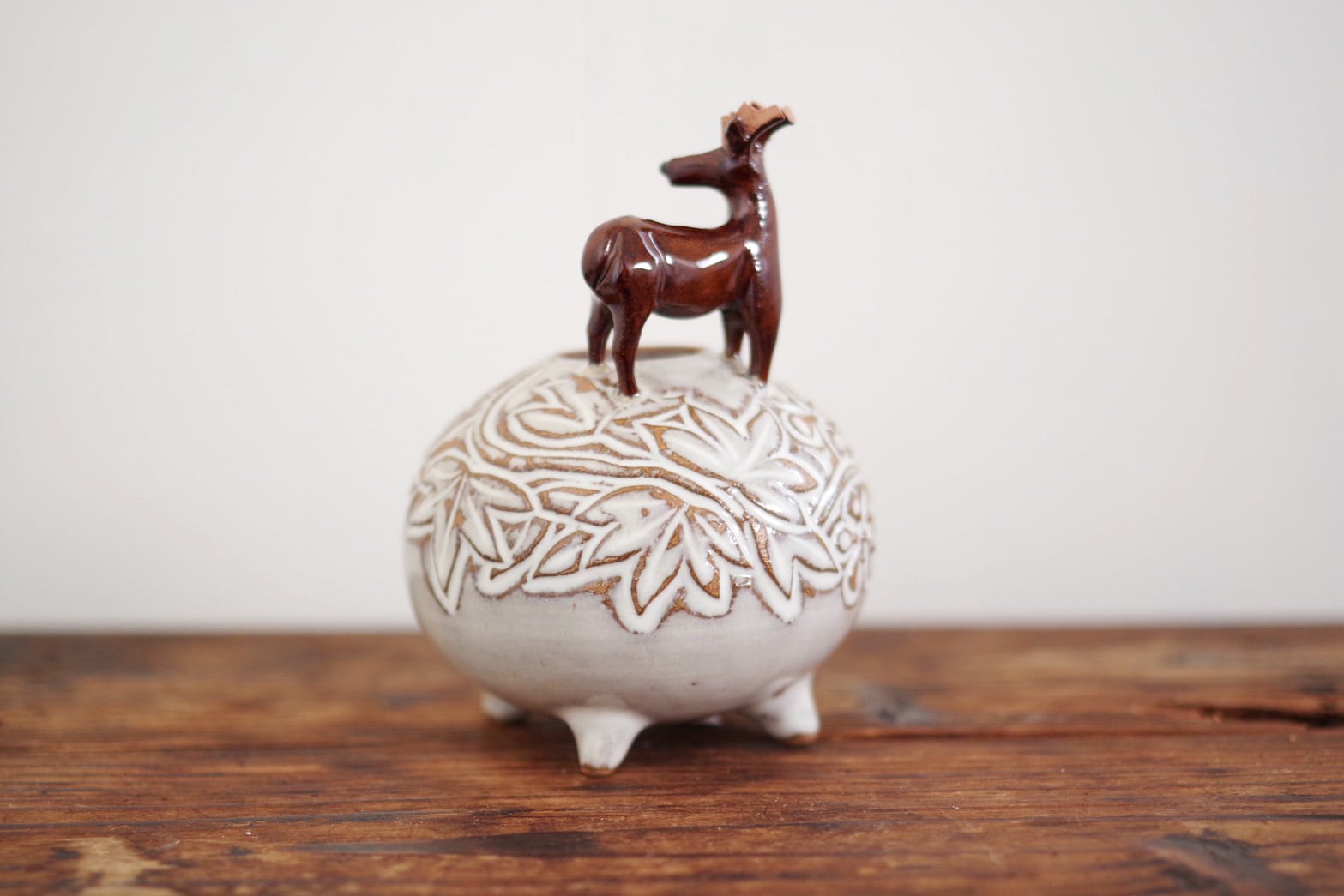 赤膚焼 雲錦彫鹿付き丸壺