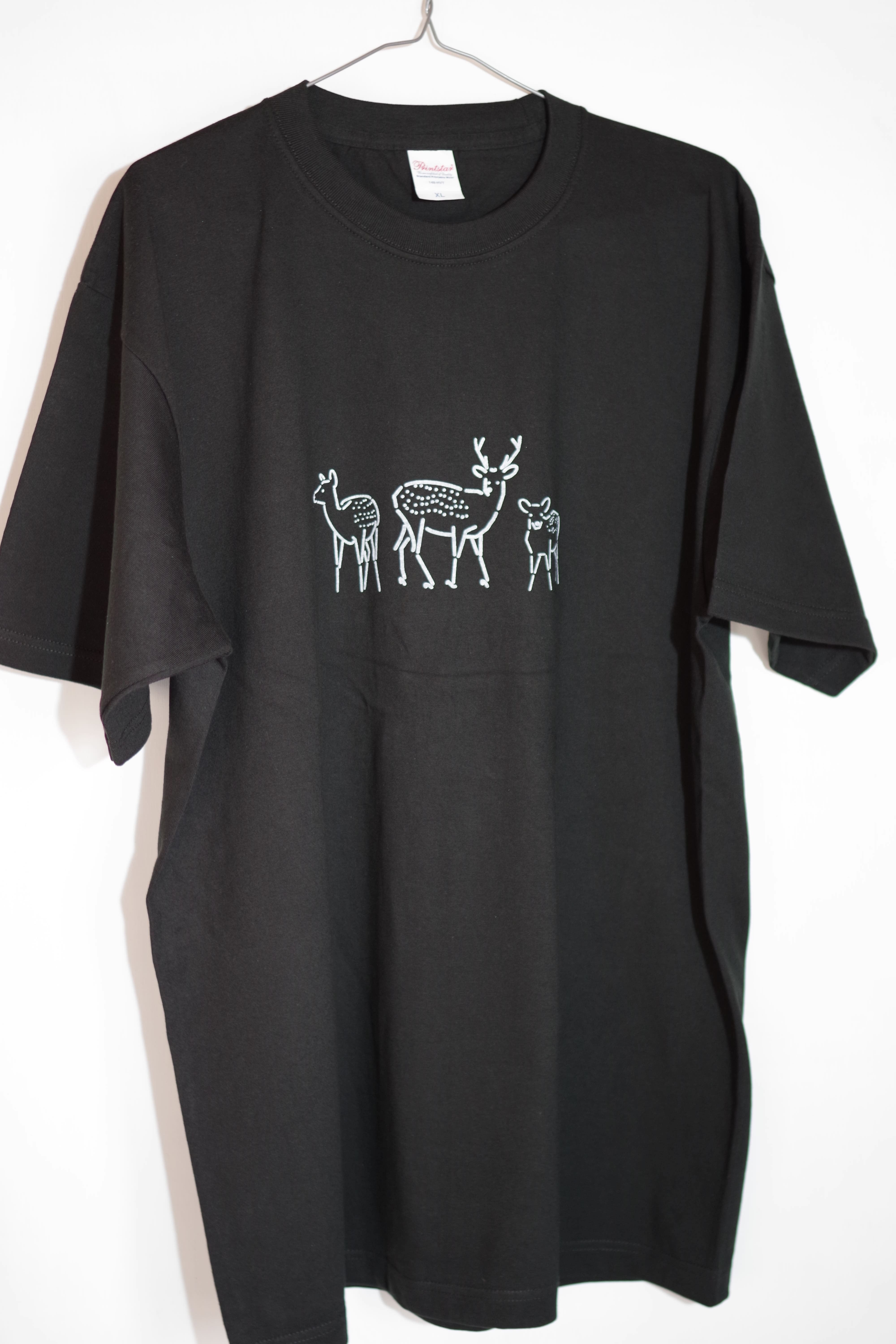 シカと一緒にお出かけするTシャツ オーバーサイズプリントTシャツ(ブラック×ホワイト)